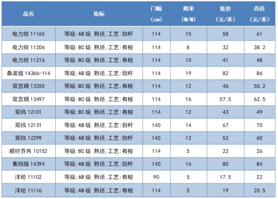 本周綢緞指數(shù)協(xié)作單位成交價(jià)格區(qū)間