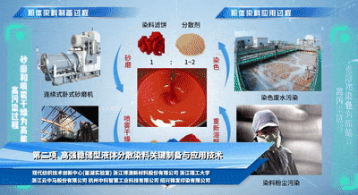 與傳統(tǒng)粉狀染料相比,液體分散染料兼具綠色與數(shù)字化優(yōu)勢(shì)。項(xiàng)目從理論、工藝、裝備三個(gè)層面切入,產(chǎn)學(xué)研用聯(lián)動(dòng),構(gòu)建了“高濃染料—高效分散劑—假塑性增黏劑”三元穩(wěn)定體系,研制了力份與粉體相當(dāng)?shù)母邚?qiáng)穩(wěn)儲(chǔ)型液體分散染料,實(shí)現(xiàn)了染料生產(chǎn)、儲(chǔ)運(yùn)與應(yīng)用的全流程高效穩(wěn)定化。項(xiàng)目技術(shù)達(dá)到國(guó)際先進(jìn)水平。