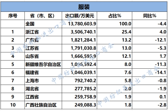 2025年1-11月,我國紡織服裝累計出口2678.18億美元,同比下降1.9%。浙江省、江蘇省、廣東省、山東省、福建省分別列全國紡織服裝出口省市前五位,合計比重超七成。