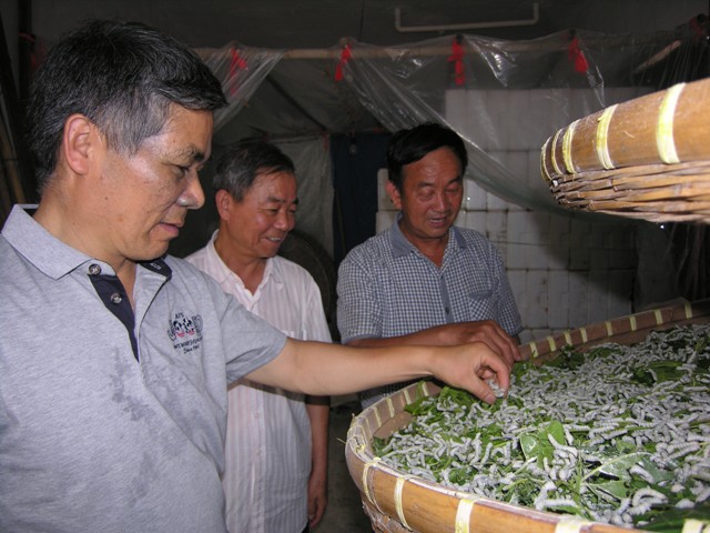 下圖為秀洲區(qū)蠶桑技術(shù)人員在新塍鎮(zhèn)潘家浜村6組蠶農(nóng)家中指導(dǎo)飼養(yǎng)好夏蠶。