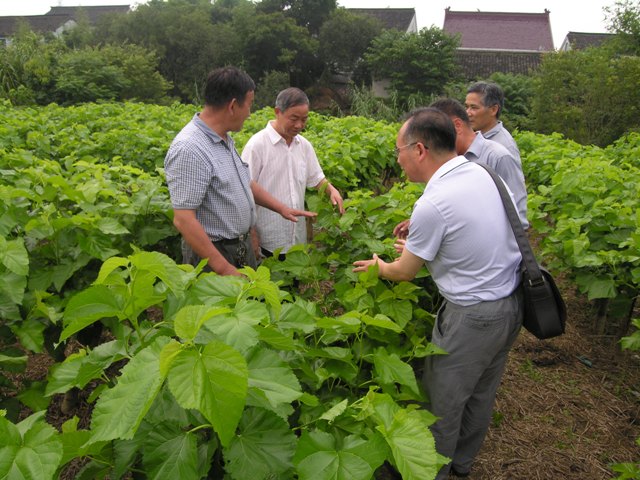 下圖為秀洲區(qū)蠶桑技術(shù)人員在新塍鎮(zhèn)潘家浜村6組桑園內(nèi)指導(dǎo)蠶農(nóng)抓好夏季培桑工作。