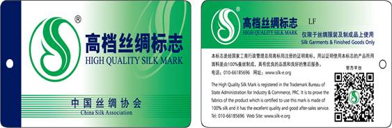 備注:最新版標簽已將舊版 “中國絲綢協(xié)會品質(zhì)認證” 中的“品質(zhì)認證”四字予以刪除,并將標簽正反面中的“高檔絲綢”改為“高檔絲綢標志”。