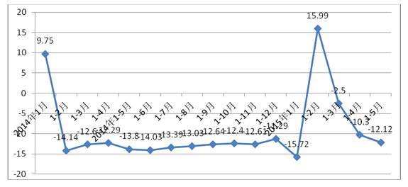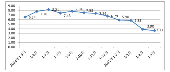 圖二: 2014年5月-2015年5月絲綢工業(yè)利潤(rùn)增速情況