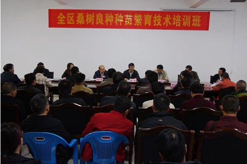 2015年11月11日,廣西蠶業(yè)技術(shù)推廣總站在賓陽縣舉行全區(qū)桑樹良種種苗繁育技術(shù)培訓(xùn)班暨全區(qū)蠶桑生產(chǎn)技術(shù)冬季大培訓(xùn)啟動儀式。自治區(qū)農(nóng)業(yè)廳謝東副廳長、農(nóng)業(yè)廳經(jīng)作處吳孝文副處長,廣西蠶業(yè)技術(shù)推廣總站祁廣軍站長、陸瑞好書記,南寧市農(nóng)委歐桂蘭總農(nóng)藝師,賓陽縣政府朱亞明縣長、潘蔭文副縣長出席了培訓(xùn)班,全區(qū)蠶桑生產(chǎn)主產(chǎn)市、縣蠶業(yè)部門和廣西蠶業(yè)科學(xué)研究院分院負(fù)責(zé)人、廣西蠶業(yè)技術(shù)推廣總站相關(guān)人員共50多人參加培訓(xùn)。