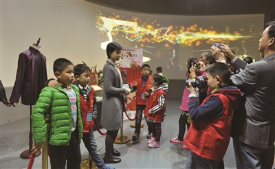來到APEC北京峰會領(lǐng)導(dǎo)人所穿的原版“新中裝”展區(qū),小記者和家長們紛紛拿起相機(jī)拍照留影。
