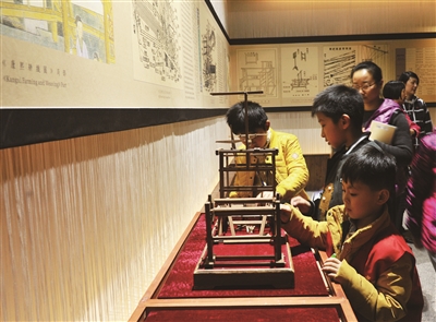 在《康熙耕織圖》前,小記者邊讀著詩句“萬縷千絲織得成”,邊認(rèn)真觀摩擺放的一部模型織機(jī)。