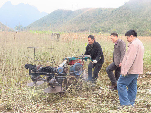 河池市農(nóng)機推廣站自主研發(fā)小型桑樹伐條機下地實驗