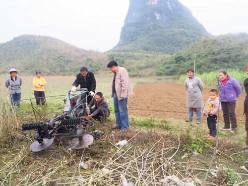 經(jīng)過積極探索和研發(fā),1月7日,河池市農(nóng)機推廣站在宜州市德勝鎮(zhèn)進行了小型履帶式桑樹伐條機的下地實驗。該機采用手扶式小型3角履帶底盤,以6匹柴油機為動力,前端搭載雙行伐條裝置進行桑樹伐條作業(yè)。實驗中,伐條的刀盤和桑條聚攏裝置達到了設(shè)計的預(yù)期效果,但是還存在通過性差和操作困難等缺點。通過下地實驗收集到了許多寶貴的數(shù)據(jù),為下一步的改進工作積累了寶貴的經(jīng)驗。
