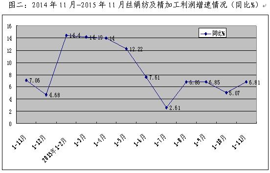 據(jù)國家統(tǒng)計局統(tǒng)計,2015年1-11月,全行業(yè)主營業(yè)務(wù)收入1088.57億元,同比增長3.8%;利潤54.8億元,同比增長6.81%,其中繅絲加工實現(xiàn)利潤32.67億元,同比增長8.17%,絲織加工實現(xiàn)利潤19.62億元,同比增長5.44%,絲印染加工實現(xiàn)利潤2.5億元,同比增長0.48%??傮w來看,2015年1-11月全行業(yè)主營業(yè)務(wù)增速呈現(xiàn)逐漸走低態(tài)勢(見圖一),增速較去年同期小幅回落3.54個百分點,行業(yè)利潤增速較去年同期下降了0.25個百分點(見圖二)。各分行業(yè)利潤對比情況見圖三。