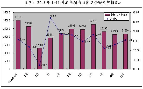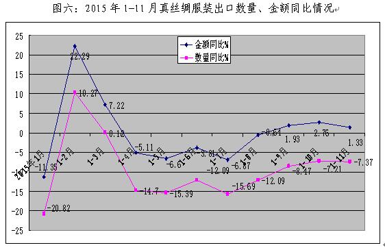 1、絲綢商品出口金額下降明顯。2015年1-11月,我國真絲綢商品出口總額為25.47億美元,同比下降10.45%。從出口金額單月數(shù)據(jù)看(見圖五),1、2月份受春節(jié)長假影響出口下降,3月份開始出現(xiàn)恢復(fù)性增長,但在5月持續(xù)回落并呈現(xiàn)逐漸走低趨勢,全年單月出口數(shù)據(jù)幾乎均低于去年同期。全國絲綢商品出口在2014年下降11.29%的基礎(chǔ)上,2015年繼續(xù)下降10.45%,顯示出整個絲綢外貿(mào)出口形勢更趨嚴峻。