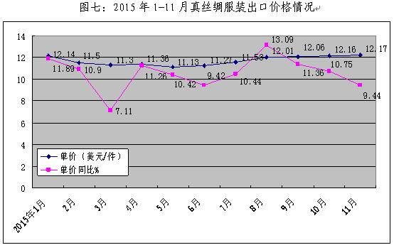 2、真絲綢服裝出口量減價升。2015年1-11月,真絲綢服裝出口數(shù)量在年初沖高之后迅速回落,第四季度略有回升,數(shù)量同比下降7.37%。但從出口單價來看,1-11月真絲綢服裝平均出口單價12.17美元,同比增長9.44%,較去年同期增長了1.05個百分點,第三、四季度出口單價略有上揚(見圖六、圖七)