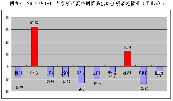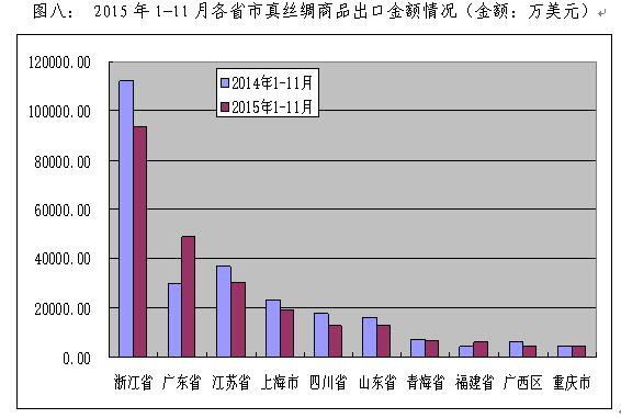 3、主要省市出口全線下降。2015年真絲綢商品出口金額各省市排名情況分析(見圖八、圖九),排名前十位的浙江、廣東、江蘇、上海、四川、山東、青海、福建、廣西、重慶等省市中,僅有廣東和福建實現(xiàn)增長,同比增長64.28%和24.74%。其中,廣西和四川出口下降幅度較大,分別下降27.82%和26.6%。