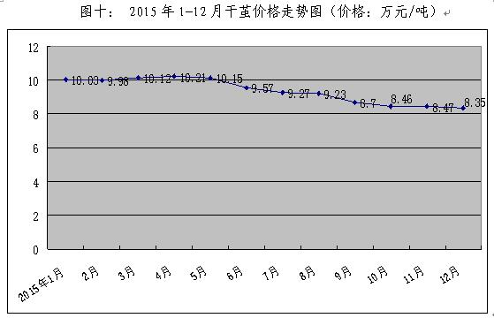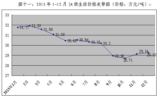 2015年,面對國際市場需求持續(xù)疲軟,國內(nèi)市場絲綢下游服裝、家紡等產(chǎn)品庫存高企,消費需求增長乏力,行業(yè)外貿(mào)出口持續(xù)下滑,加上繭絲供應(yīng)量充足,干繭和生絲價格一路下行。截止到12月底,干繭和生絲價格分別較2014年同期下跌18.06%和7.05%,繭絲價格頹勢較為明顯。