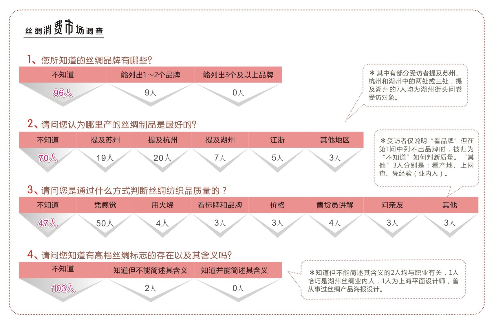 昊策咨詢公司最近通過互聯(lián)網(wǎng)問卷和街頭問卷相結(jié)合的方式對北京、上海、杭州、深圳、蘇州、湖州等六個城市進(jìn)行初步的絲綢消費(fèi)隨機(jī)抽樣調(diào)查。統(tǒng)計(jì)105份有效問卷中關(guān)于質(zhì)量和品牌的四個無選項(xiàng)開放問題時,發(fā)現(xiàn)消費(fèi)者對絲綢質(zhì)量和品牌的認(rèn)知幾乎是空白的。