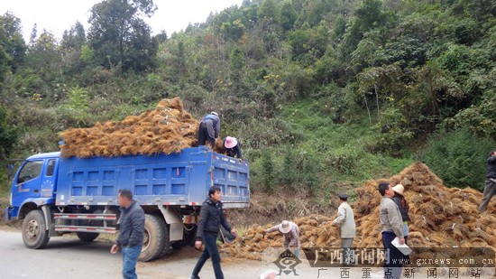 圖為群眾正在把優(yōu)質(zhì)桑苗裝車送往鄉(xiāng)下。廣西新聞網(wǎng)通訊員 岑新東
