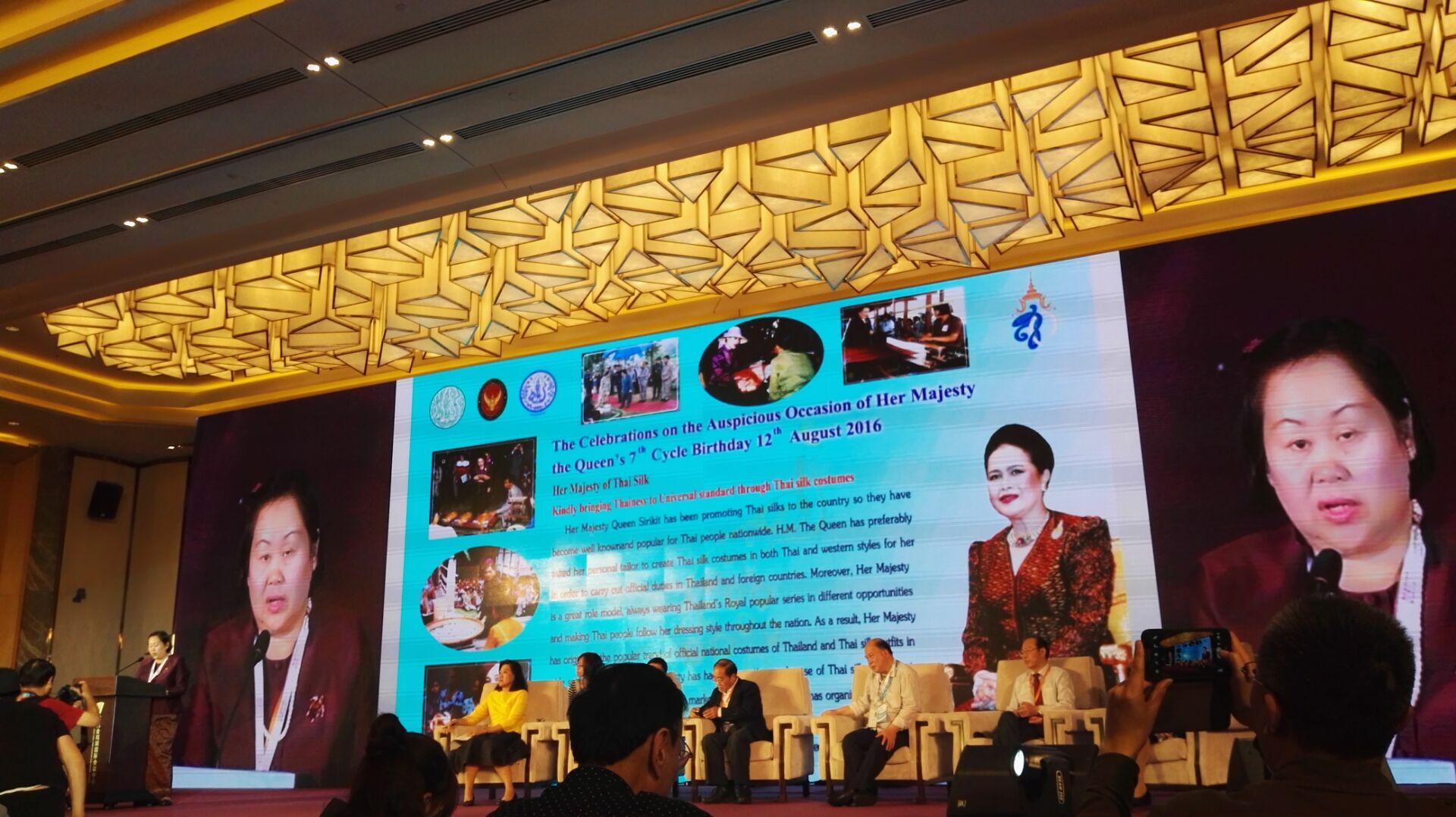 “ Choomyanut Comwong:女士們,先生們,大家下午好。我是泰國蠶桑絲綢局的代表Choomyanut,我們局成立于2009年12月4日,是屬于泰國的農業(yè)部,到現(xiàn)在我們在不斷的提高絲綢產業(yè),從上游原料到現(xiàn)有應用的管理能力,我們主要的任務就是加強泰國絲綢及相關產業(yè),包括保護泰國絲綢的發(fā)展,促進絲綢及相關產品的各個方面。比如說生產方面,加工方面,或者市場方面。但是最重要的還是為了滿足一直支持泰國的傳統(tǒng)絲綢的王后的喜愛。 我們進入今天的話題,我今天來講的是關于泰國絲綢面料和金孔雀標志。泰國的孔雀標志是用來表示絲綢已達到認證標準的標志,這個標志的條件有兩個,一個是一定要在泰國生產的,第二個是選用的絲線應該是高質量的。目前我們把孔雀標志分成四種顏色,來表示不同的質量和等級。第一種是金色的孔雀標志,得到這個標志的產品上會有兩個標簽,第一個就是金色的孔雀標志,第二個是二維碼,可以通過這個二維碼看到該產品的信息,還有得到金孔雀標志的產品要達到三個標準,第一是采用最傳統(tǒng)的工藝,第二是用手工編織,經紗和緯紗都要泰國傳統(tǒng)的絲線品種。第三,每個過程都是要手工的,不能用繅絲機。 第二種標志是金色的孔雀標志,得到金色的孔雀標志的產品上也會有兩個標簽,跟剛才一樣的,但是只是換成銀色的。得到銀色孔雀標志的產品要達到三個標準:第一同時采用傳統(tǒng)和現(xiàn)代的工藝。第二,使用的絲綢品種是泰國傳統(tǒng)品種,或者泰國改進的品種。第三,可以使用繅絲機,但是繅絲機不能超過五馬力。 第三種標志是藍色的孔雀標志,得到藍色孔雀標志的產品上也是有兩個標簽,但是也要通過三個標準。因為商業(yè)用途的原因,所以在生產的過程當中,會采用一些現(xiàn)代化的技術,第二,要用純真絲,百分之百天然真絲面料,第三,使用哪種織布機都可以。 最后一種是綠色的孔雀標志,得到這種標志的產品,需要達到四個標準,第一,混合使用傳統(tǒng)和現(xiàn)代的圖案和顏色,第二,使用真絲混紡面料,第三,要指出面料成分含量,第四,使用哪種織布機都可以。 目前我們通過孔雀標志來創(chuàng)造泰國絲綢產品的價值,比如說一些泰國比較出名的產品,如果你們對這些產品有興趣,或者想要了解更多的話,歡迎你們來到我們泰國,謝謝大家?!?