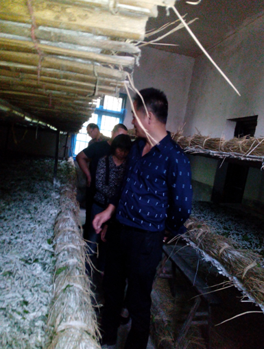 圖為蠶桑技術(shù)人員正在養(yǎng)蠶示范戶鐘根泉家現(xiàn)場指導(dǎo)
