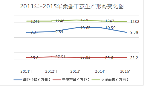 2015 年,全國桑園面積1232 萬畝,比上年(下同)減少0.8%;桑蠶繭發(fā)種量1578 萬張,減少3%;桑蠶繭產(chǎn)量63 萬噸(合干繭25.2 萬噸),減少2.1%;桑蠶繭收購均價(jià)1698 元/50 公斤,下降5.8%,蠶農(nóng)實(shí)現(xiàn)收入199 億元人民幣,減少6.6%。(以上數(shù)據(jù)來自商務(wù)部辦公廳、農(nóng)業(yè)部辦公廳)