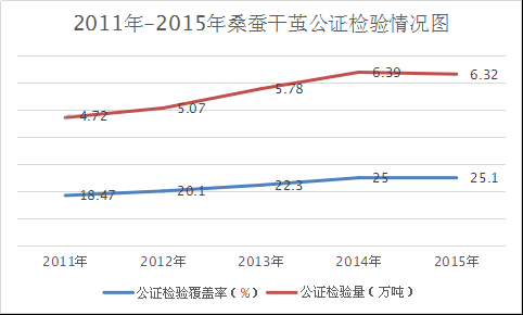 2015年桑蠶干繭公證檢驗(yàn)量為63222.10噸,覆蓋率為25.09%,同比去年提高0.1%。受檢桑蠶干繭經(jīng)濟(jì)價(jià)值逾59億元。