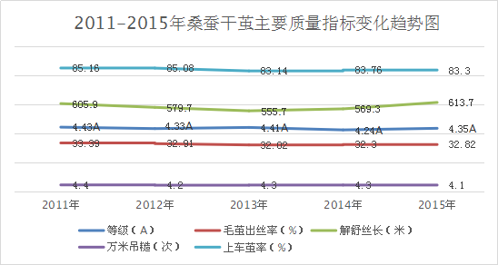 2015年全國桑蠶干繭年平均質(zhì)量為4.35A3361Ⅱ。即:清潔/潔凈等級(jí)(以下簡稱絲等級(jí))為4.35A、毛繭出絲率32.82%、解舒絲長613.7米、萬米吊糙4.1次、上車?yán)O率83.30%。主要質(zhì)量指標(biāo)除上車?yán)O率同比略有下降外,絲等級(jí)、毛繭出絲率、解舒絲長、萬米吊糙和解舒率等指標(biāo)均小幅提升,上述指標(biāo)同比分別提升0.11A、0.52個(gè)百分點(diǎn)、44.4米、0.2次、和3.50個(gè)百分點(diǎn),這是自2012年、2013年連續(xù)2年下降,2014年小幅反彈后的進(jìn)一步提高。從2011年至2015年統(tǒng)計(jì)數(shù)據(jù)來看,桑蠶干繭年總產(chǎn)量基本穩(wěn)定在25~26萬噸之間,其綜合質(zhì)量總體保持穩(wěn)定,并有一定程度的提升。