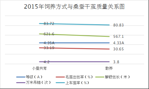 2015年桑蠶干繭公證檢驗(yàn)受檢樣品中采用小蠶共育的飼養(yǎng)方式的共計(jì)54135.63噸,占比85.51%,質(zhì)量等級(jí)為4.35A3362Ⅱ。采用散養(yǎng)飼養(yǎng)方式的共計(jì)9172.94噸,占比14.49%,質(zhì)量等級(jí)為4.33A3157Ⅱ。采用小蠶共育飼養(yǎng)方式的桑蠶干繭質(zhì)量各個(gè)指標(biāo)均高于采用散養(yǎng)方式的桑蠶干繭質(zhì)量指標(biāo)。其中絲等級(jí)高了0.02個(gè)等級(jí),毛繭出絲率高了2.54個(gè)百分比,解舒絲長長了54.5米,萬米吊糙多了0.4次。