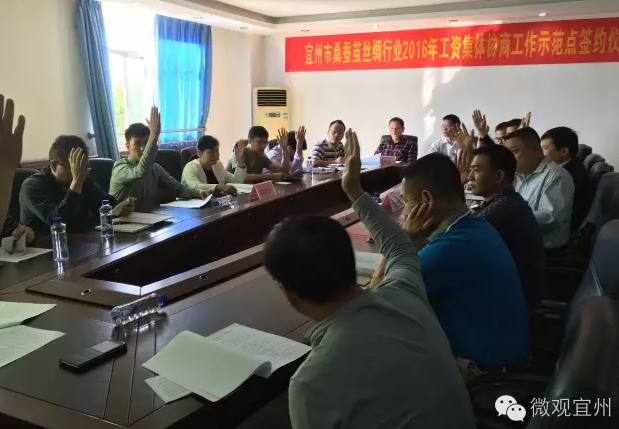 簽約儀式上,與會(huì)人員表決通過工資集體協(xié)商合同(草案),簽訂了《2016年度宜州市桑蠶繭絲綢行業(yè)性工資專項(xiàng)集體合同》。