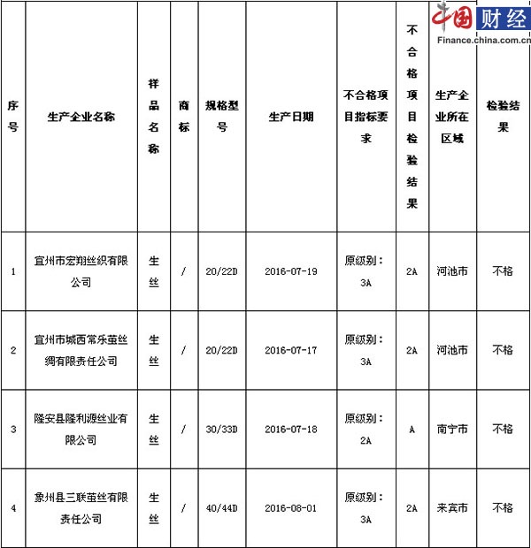 中國網(wǎng)財經(jīng)12月19日訊 廣西壯族自治區(qū)質(zhì)量技術(shù)監(jiān)督局官網(wǎng)近日通報了2016年生絲產(chǎn)品質(zhì)量廣西監(jiān)督抽查情況,共抽取廣西區(qū)內(nèi)50家企業(yè)生產(chǎn)的50批次產(chǎn)品,不合格產(chǎn)品4批次,不合格產(chǎn)品檢出率8.0%。