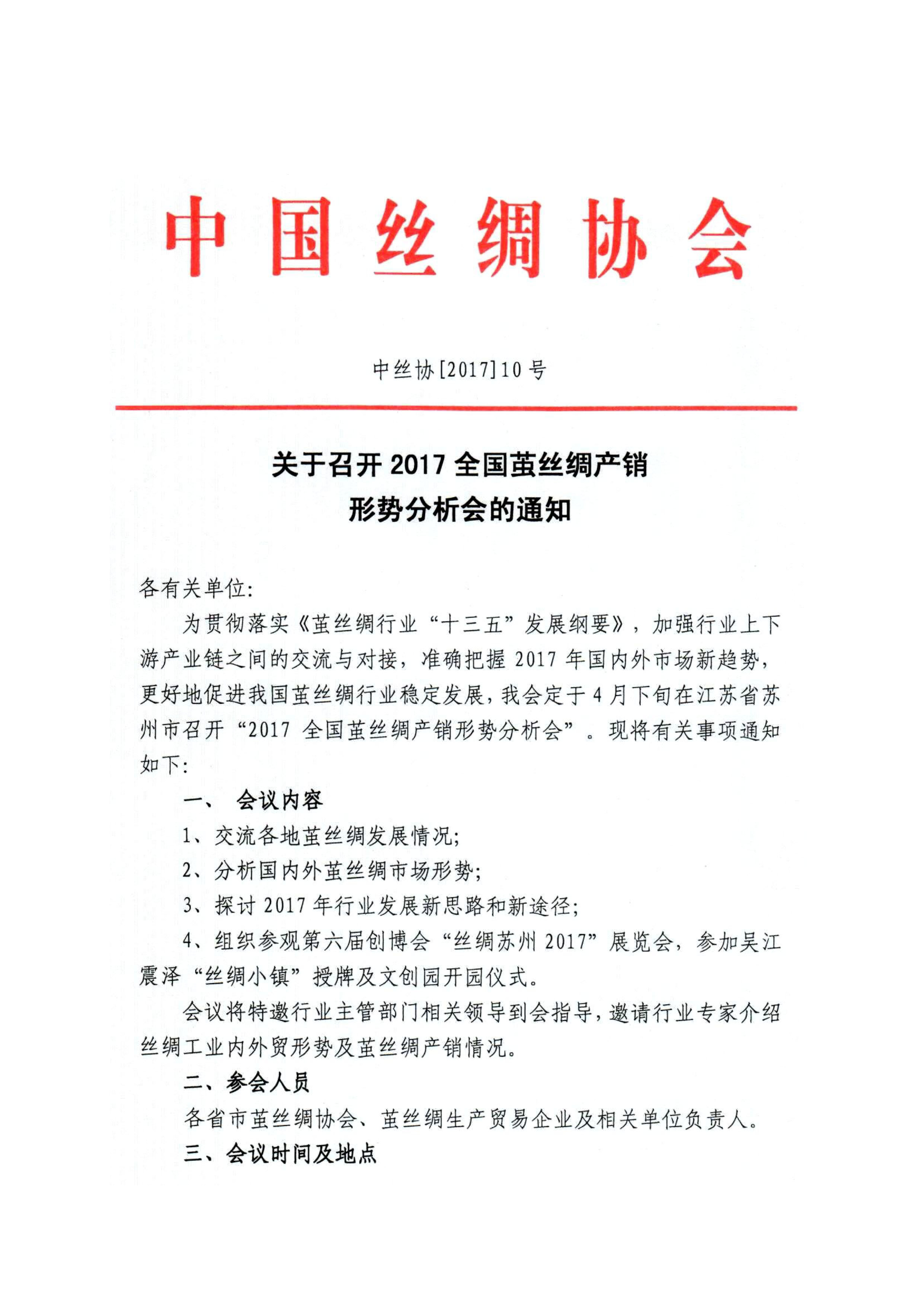 中國絲綢協(xié)會(huì)關(guān)于召開2017全國繭絲綢產(chǎn)銷形勢分析會(huì)的通知