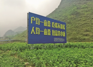 在古壽村通往德??h城的路上,記者看到,公路兩旁不時(shí)現(xiàn)出綠油油的桑葉,一張廣告牌上赫然寫著:戶均一畝桑,吃喝不用慌;人均一畝桑,致富奔小康(如上圖)。據(jù)說(shuō),這是基層干部跟當(dāng)?shù)剜l(xiāng)村善長(zhǎng)唱山歌的老人在工作中商量提煉出來(lái)的宣傳語(yǔ),生動(dòng)展現(xiàn)了當(dāng)?shù)馗刹咳罕娦倪B心一起為地方脫貧奔小康努力奮進(jìn)的新氣象。