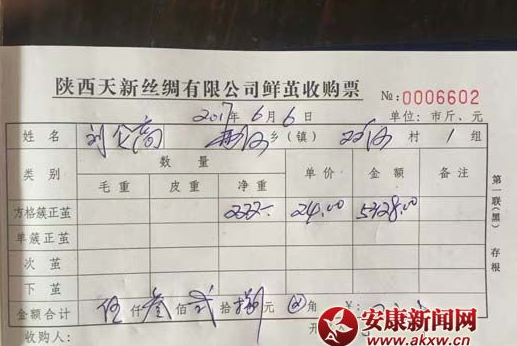 6月6日,是石泉縣兩河鎮(zhèn)雙河村一組蠶農(nóng)劉侖高最高興的日子,當(dāng)天他的第一批方格簇春蠶繭222斤賣得了5328元現(xiàn)金,賣出了24元/市斤的好價(jià)錢,這標(biāo)志著石泉縣從此拉開(kāi)了2017年春季蠶繭收購(gòu)的序幕。