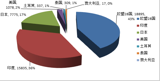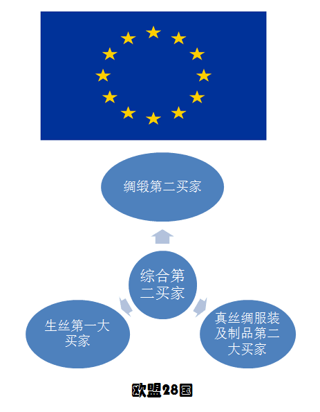 從生絲凈買金額看,歐盟28國、印度、日本分別以43%、36%、17%的份額位居前三位,可見歐盟28國才是是全球生絲最大的買家。