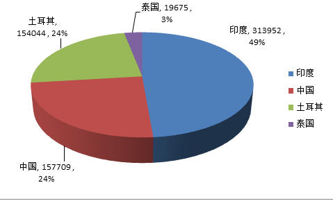 從真絲綢服裝及制品凈出口金額看,印度、中國、土耳其、泰國位居前四位。印度是全球真絲綢服裝及制品最大的賣家,中國居第二位。