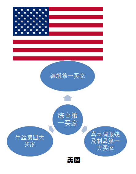 從真絲綢緞凈買入金額看,美國、歐盟28國、泰國、巴西、馬來西亞、澳大利亞、印度位列1-7位,美國成為全球真絲綢緞最大的買家。