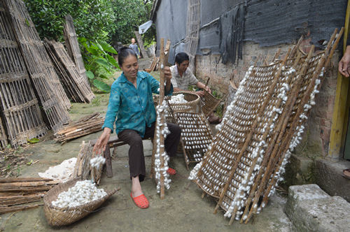 在該組鄧會平的蠶房邊,幾位親友在幫忙摘蠶繭。堂屋里,鄧會平的丈夫正在管理小蠶。他告訴筆者,他家下一批我領(lǐng)了8張蠶種,自己育種,現(xiàn)在小蠶已經(jīng)進入二齡了。