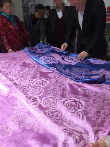 進(jìn)入展廳后,工作人員先是內(nèi)容講解,包括絲綢織造的起源、工藝、過程等,可以看到一些絲綢展品等,不過,整個停留的時間很短,大約五六分鐘,之后工作人員就把大家都帶領(lǐng)到一間單獨(dú)隔開的 "VIP 展廳 "。" 展廳 " 實(shí)為一間約 20 平米的房間,待大家都進(jìn)入后,工作人員就會把門關(guān)上。里面四周貨架上都擺放著蠶絲被和四件套等制品,中間是一個床大小的臺子。" 大家都過來聚一聚,聽我講一講蠶絲。" 大家聚集在臺子周邊,工作人員就開始講解蠶絲是如何加工成一整條蠶絲被的,甚至現(xiàn)場從蠶絲被中抽出一部分蠶絲講解真假蠶絲的鑒別辦法。緊接著,工作人員就開始把他們?nèi)康臒崆榉旁谕其N四件套、蠶絲被上。" 同樣的蠶絲被,在杭州有個絲綢博物館,要賣 5999 元,為什么,他們是一線城市,我們這里是工廠價,便宜 1000 多元,4980 元 ……" 工作人員大概介紹了 10 余種四件套。