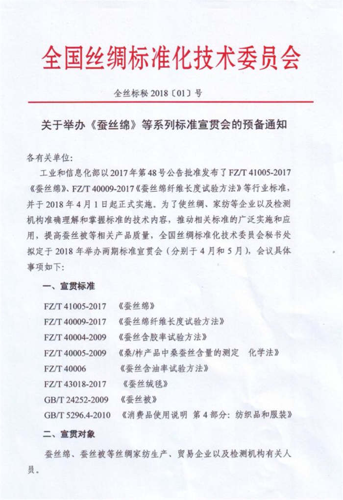 工業(yè)和信息化部以2017年第48號公告批準(zhǔn)發(fā)布了FZT41005-2017《蠶絲綿》、FZT40009-2017《蠶絲綿纖維長度試驗(yàn)方法》等行業(yè)標(biāo)準(zhǔn),并于2018年4月1日起正式實(shí)施。為了使絲綢、家紡等企業(yè)以及檢測機(jī)構(gòu)準(zhǔn)確理解和掌握標(biāo)準(zhǔn)的技術(shù)內(nèi)容,推動相關(guān)標(biāo)準(zhǔn)的廣泛實(shí)施和應(yīng)用,提高蠶絲被等相關(guān)產(chǎn)品質(zhì)量, 全國絲綢標(biāo)準(zhǔn)化技術(shù)委員會、浙江省絲綢協(xié)會定于2018年舉辦兩期標(biāo)準(zhǔn)宣貫會(分別于4月和5月在浙江省嘉興市和四川省南充市舉行),將宣貫《蠶絲綿》等系列標(biāo)準(zhǔn):