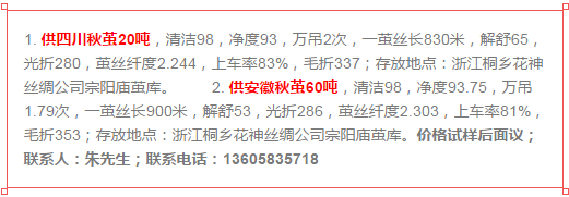 從南宋開始,杭嘉湖一直是中國繭絲綢的產(chǎn)區(qū)和貿(mào)易區(qū)。這是發(fā)布在今天金蠶網(wǎng)上的一條供求秋繭的信息??梢韵嘈?,這些蠶繭將很快離開海寧,啟程前往廣西的某個繅絲車間。