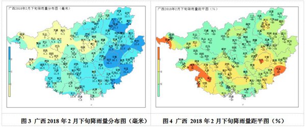 降雨:2月份降雨量全區(qū)0~39.5毫米;與常年同期相比,全區(qū)偏少4~10成,其中天峨、南丹、樂業(yè)和百色等地偏少10成。2月下旬降雨量百色、河池大部以及忻城、柳江小于5毫米,其余大部地區(qū)5.1~34.1毫米(圖3);與常年同期相比,除百色、崇左兩市局部以及桂平、岑溪、靈山等地正常到偏多1~5成外,其余大部地區(qū)偏少1~10成(圖4)。旬降雨日數(shù)全區(qū)大部3~6天,大部偏少1~4天。