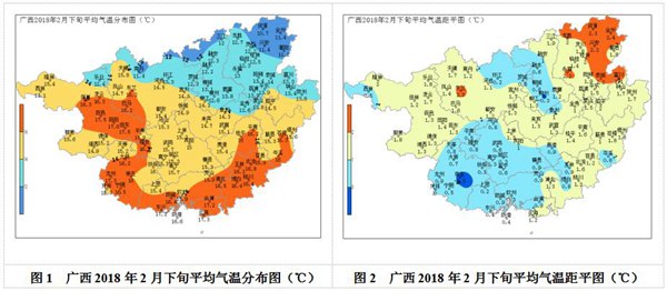 氣溫:2月份平均氣溫桂東北大部以及百色、河池北部8.7~11.9℃,桂南大部和右江河谷地區(qū)14.0~15.9℃,其余地區(qū)12.0~13.9℃;與常年同期相比,桂北、桂中大部及部分分散縣市正常到偏高1.5℃,其余地區(qū)偏低0.1~1.7℃。2月下旬平均氣溫桂東北大部、河池北部以及樂業(yè)10.7~13.9℃,其余大部14.0~17.6℃(圖1);與常年同期相比,除柳州和崇左偏低0.3℃外,其余地區(qū)正常到偏高2.4℃,其中桂林東北部以及富川、永福、東蘭等地偏高2.0℃以上(圖2);旬極端最低氣溫,桂東北大部2.8~6.9℃,其余大部地區(qū)7.1~12.5℃,全區(qū)大部出現(xiàn)在22~23日。