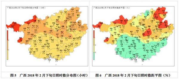日照:2月份日照時(shí)數(shù)全區(qū)37.3~103.8小時(shí);與常年同期比,桂東大部,河池、百色兩市大部以及南寧、來賓兩市局部正常到偏多1~4成,其余大部地區(qū)偏少1~3成。2月下旬日照時(shí)數(shù)全區(qū)0~27.5,其中百色局部以及天峨、象州等地大于20小時(shí)(圖5);與常年同期相比,百色、河池、來賓、桂林、賀州五市局部正常到偏多1~5成,其余大部偏少1~10成。