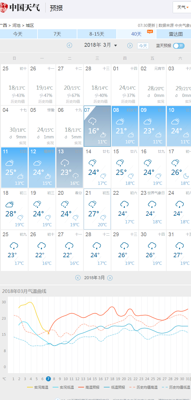 下圖為中國天氣網(wǎng)對河池市今年3月的天氣預報。預報顯示,氣溫較高,雨天較多,蠶農(nóng)應及時整理溝渠,以利排灌促進桑樹生長,減輕病蟲危害。