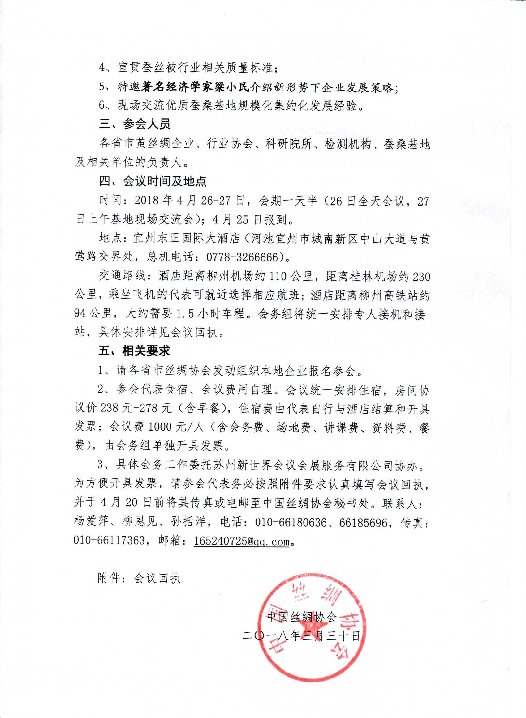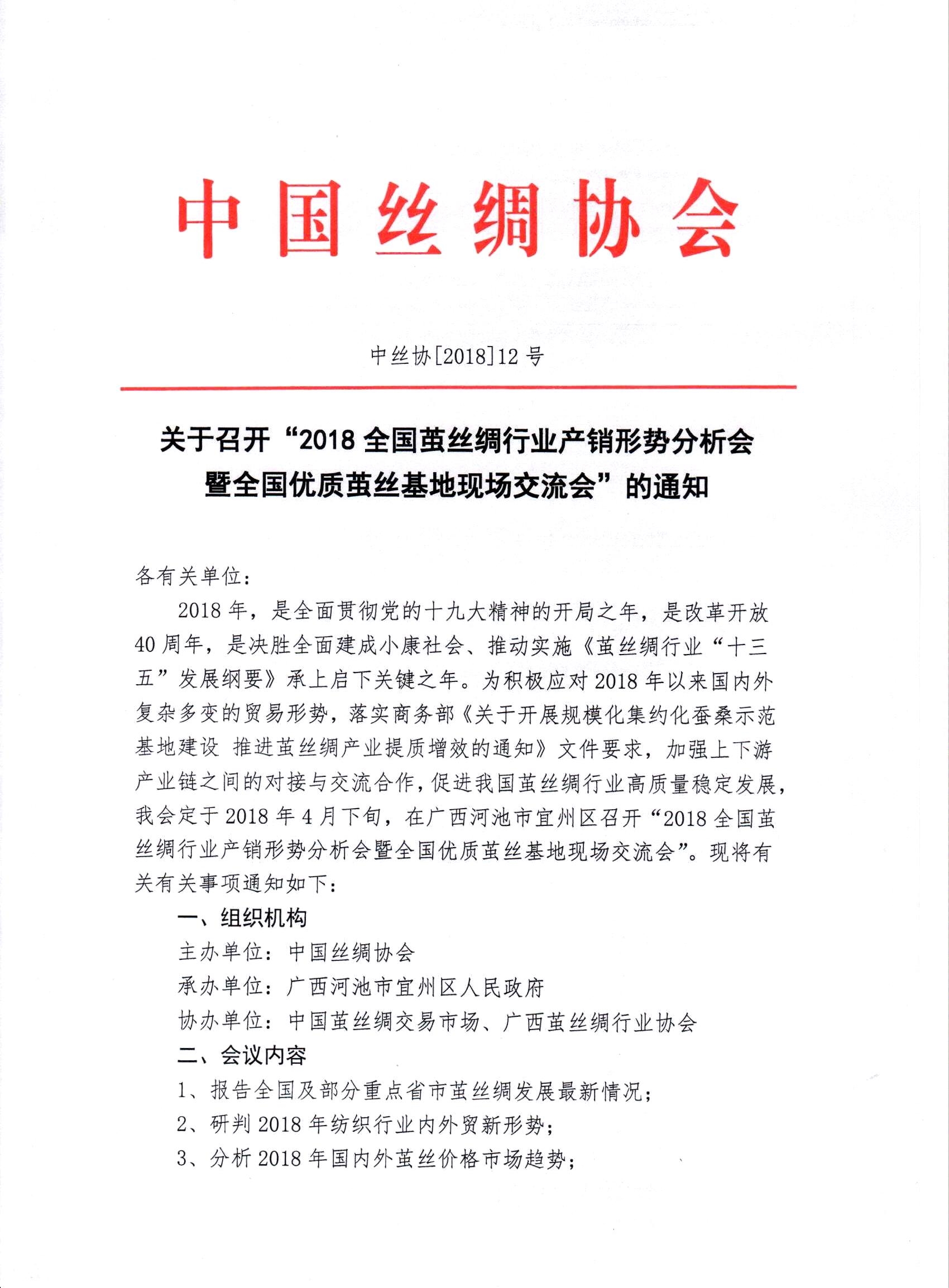 中國(guó)絲綢協(xié)會(huì)關(guān)于召開(kāi)“2018全國(guó)繭絲綢行業(yè)產(chǎn)銷(xiāo)形勢(shì)分析會(huì)暨全國(guó)優(yōu)質(zhì)繭絲基地現(xiàn)場(chǎng)交流會(huì)”的通知