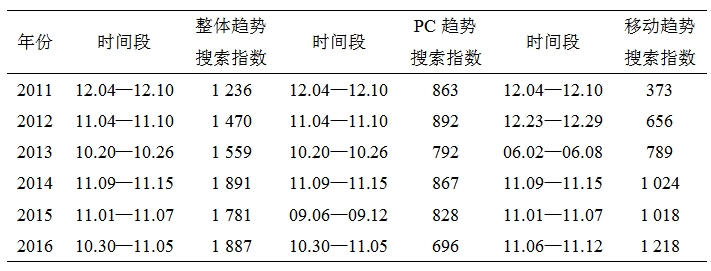 表1 搜索整體、PC端及移動端搜索指數(shù)周平均值最高時間段統(tǒng)計