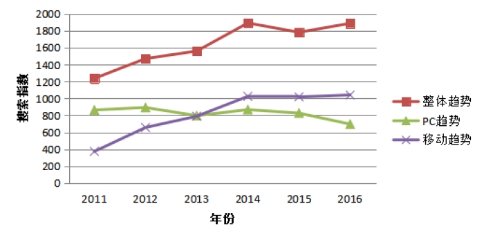圖1 2011—2016年搜索整體、PC端及移動端搜索指數(shù)周平均最高值趨勢圖