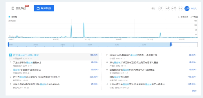 輿情洞察項(xiàng)目包括新聞監(jiān)測和百度知道。新聞監(jiān)測數(shù)據(jù)顯示媒體在互聯(lián)網(wǎng)上對特定關(guān)鍵詞的關(guān)注及報道程度及持續(xù)變化情況。從百度新聞搜索“蠶絲被”共找到相關(guān)新聞約7 040篇,2011-01-05 至 2017-01-22這個時間段內(nèi)“假貨蠶絲被”占據(jù)了主要的新聞頭條(圖4),如“百元‘蠶絲被’八成是山寨貨”“網(wǎng)購蠶絲被充斥假貨”“北京市場近半蠶絲被不達(dá)標(biāo)寶萊家紡蠶絲被竟無一根蠶絲”等。