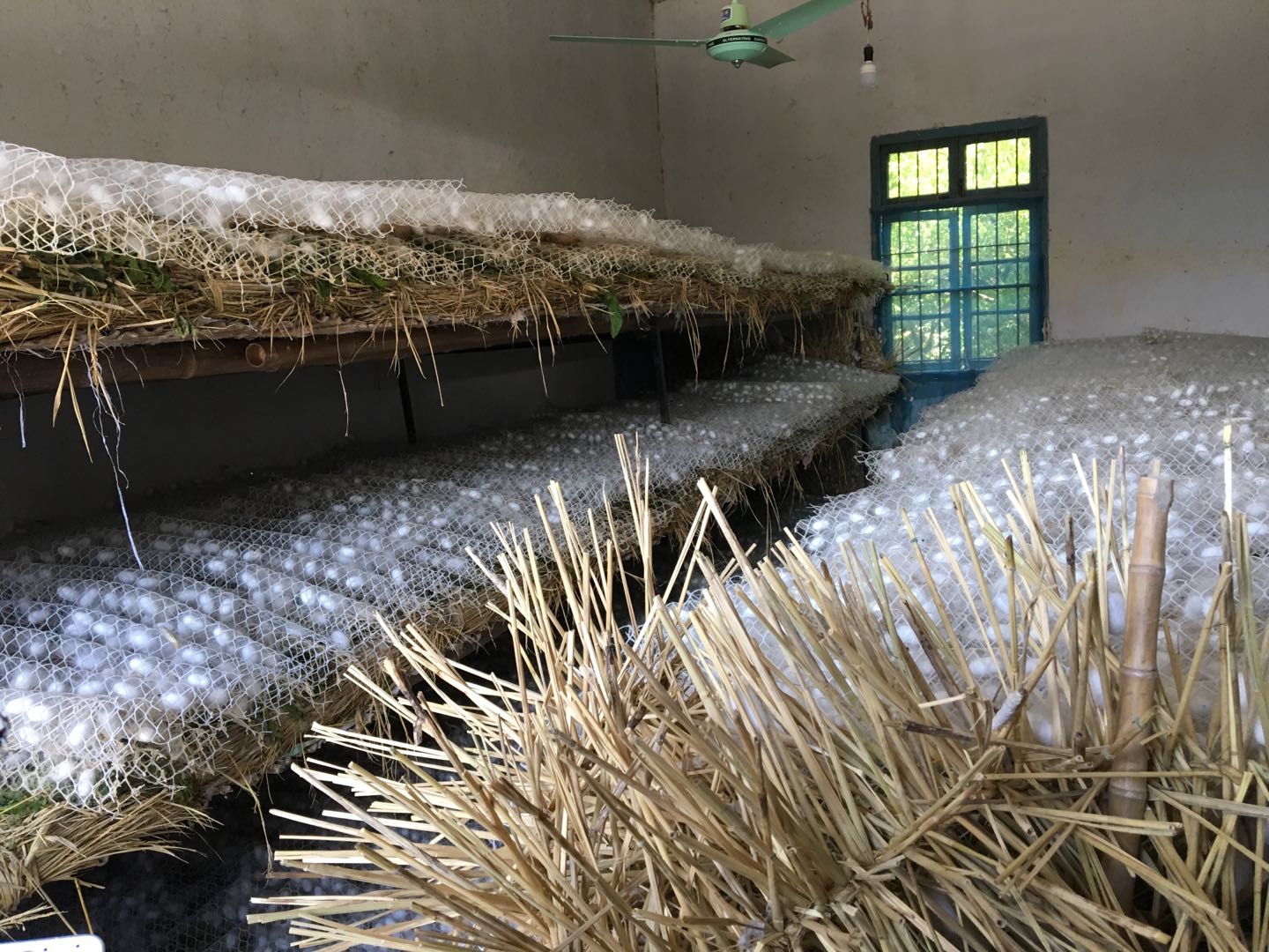 金蠶網(wǎng)工作人員今日在嘉興市王店鎮(zhèn)八聯(lián)村蠶農(nóng)鐘根泉家里,此家農(nóng)戶今天養(yǎng)5張蠶,蠶農(nóng)護(hù)理得當(dāng),蠶房條件良好,據(jù)蠶農(nóng)說,雖然上蔟前食桑時(shí)間由7天減至6天多一點(diǎn),但食桑量很大,基本喂多少吃多少,總的食桑量不減少,目前的繭子質(zhì)量也不差,他準(zhǔn)備再過兩天時(shí)間再采摘。
