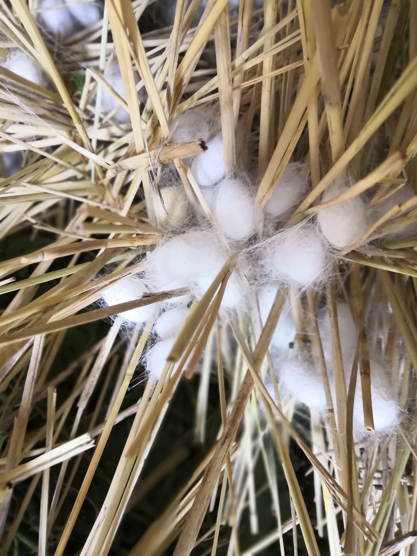 工作人員又來到莊安村徐傳金家中。他家飼養(yǎng)8張蠶種,老夫妻每天忙碌養(yǎng)蠶與果園等工作。此戶人家的春蠶營繭正常。據(jù)徐傳金夫人講,他家的繭子也不比去年差。