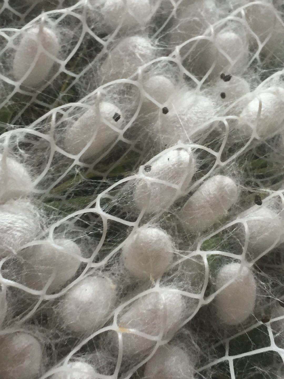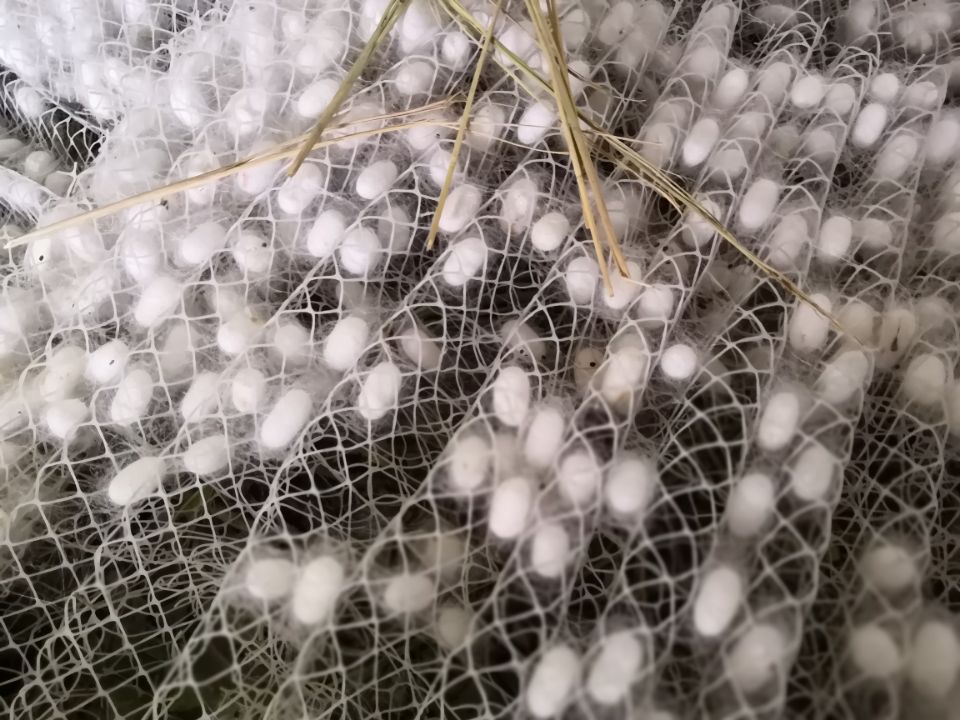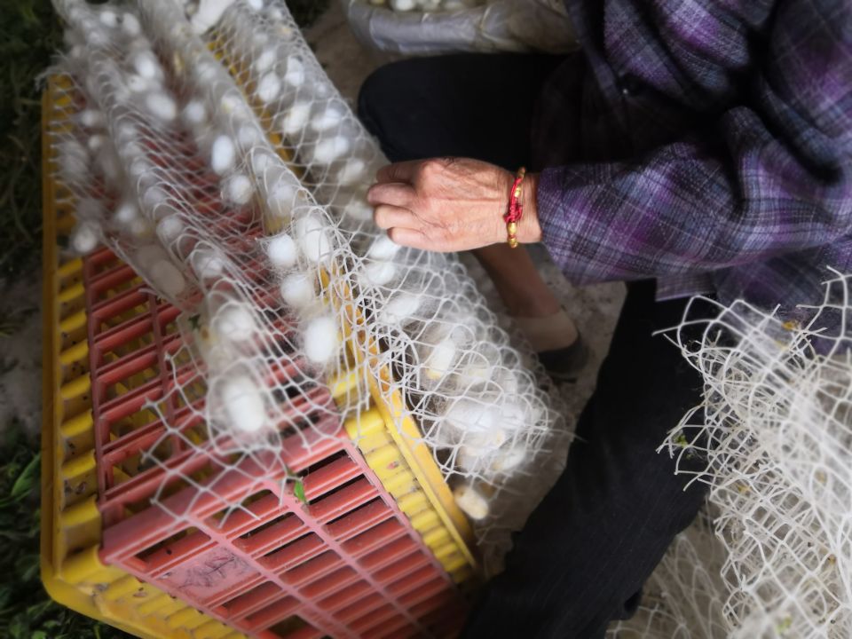 工作人員又來到假山村蠶農(nóng)裘亞琴家中,老阿姨正在采繭。此戶人家今年也養(yǎng)5張蠶,但老夫妻倆不僅養(yǎng)蠶,還做飼養(yǎng)桑園雞,非常辛苦,勞力緊張,所以上蔟時(shí)蠶偏熟了一點(diǎn),造成下層繭較多,導(dǎo)致黃斑繭增加,而上層繭正常。因?yàn)槿斯び邢?,加上蠶繭按照質(zhì)量差異銷售價(jià)差不大,所以這戶人家的蠶繭雖然上層蠶繭明顯好于下層繭,但將做統(tǒng)繭銷售。根據(jù)裘亞琴介紹,他們的繭子雖然黃斑繭偏多,但繭層不比去年差。