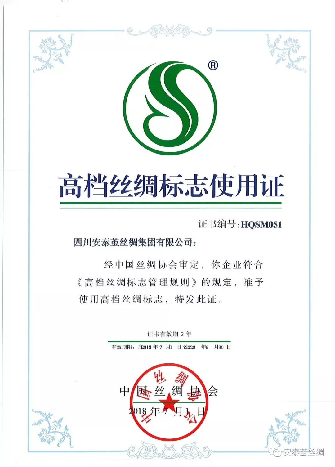 2018年6月,四川安泰繭絲綢集團(tuán)有限公司被中國絲綢協(xié)會授予“中國高檔絲綢標(biāo)志”使用證書。這是繼2007年我公司通過國家質(zhì)量認(rèn)證中心質(zhì)量體系認(rèn)證以來,又一次獲得行業(yè)最高信譽(yù)身份認(rèn)證。