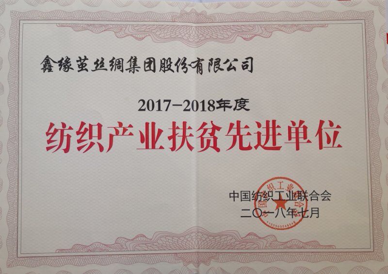 熱烈祝賀鑫緣繭絲綢集團(tuán)股份有限公司等三家絲綢企業(yè)榮獲“2017-2018年度紡織產(chǎn)業(yè)精準(zhǔn)扶貧先進(jìn)單位”稱號(hào)!